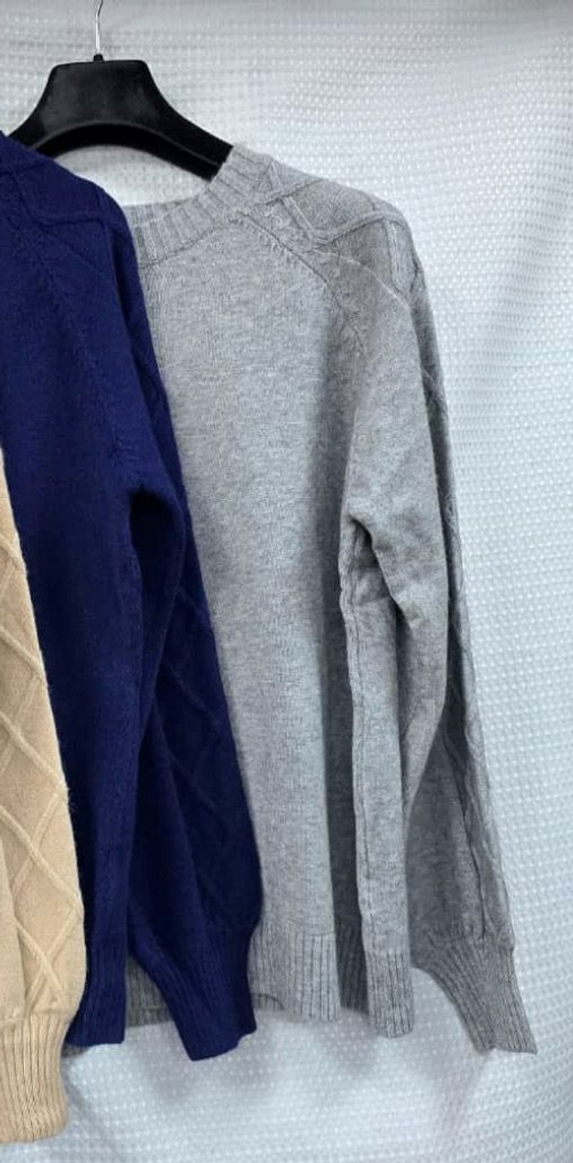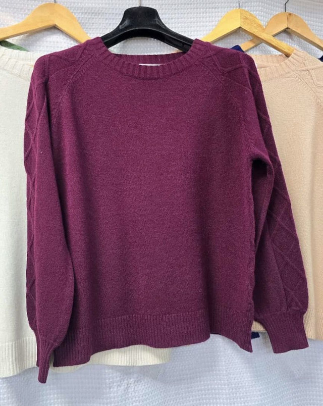 Super soft, stretch knit jumper. Crew neck, long sleeves with diamond shape cable detail. Ribbed cuffs and hem. Poly viscose.