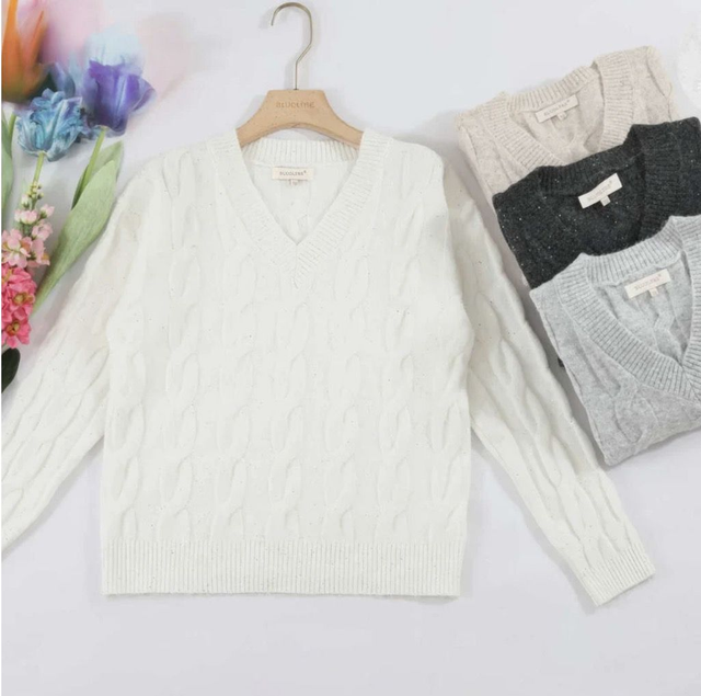 A super soft-touch cable knit with subtle sparkle detail and a flattering v -neck design. Perfect for layering or wearing on its own, offering a chic yet cozy look.