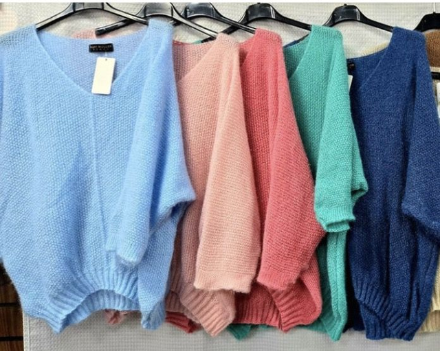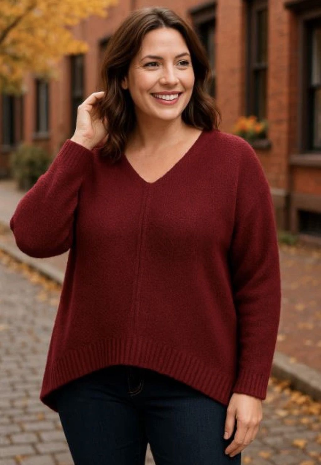Soft touch V Neck boucle hi low knit. Wardrobe staple basic knit. Front seam detail and ribbed trim hem. One size (fits size 8-18). Made in italy